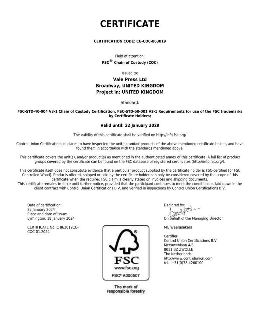 Vale Press Ltd are pleased to report that, once again, we have passed our FSC audit with flying colours and that certification has now been extended for a further five years.